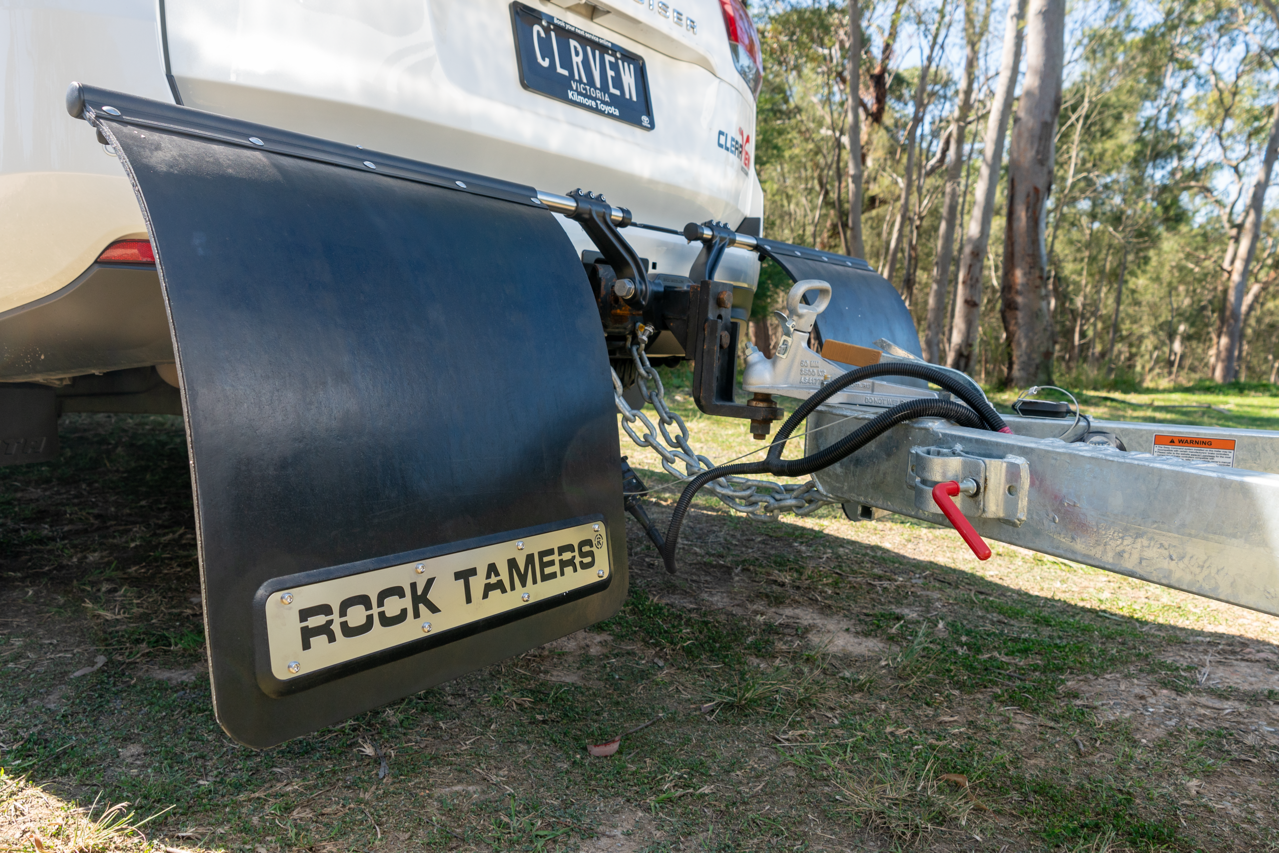 Rock Tamers are a heavy-duty stone guard system that mounts to your tow bar, helping deflect rocks, mud and debris kicked up by your tyres.