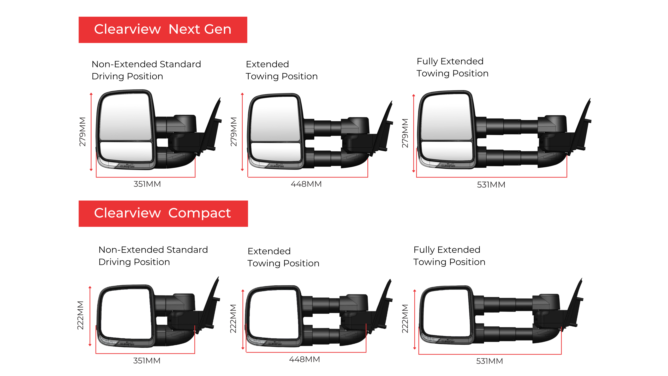 Both Clearview Next Gen and Compact Mirrors extend up to 180 mm, giving you improved side visibility when towing. Each mirror features three adjustable driving positions: